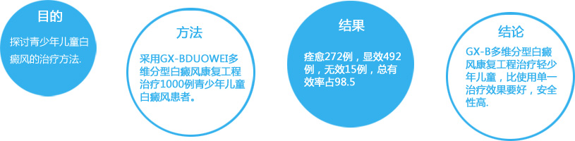 白癜风是一种皮肤科常见的疾病, 以色素脱失和黑素细胞选择性破坏为特征, 有一定的遗传背景,但其发病机制尚不完全清楚。青少年儿童白癜风有不同于成人白癜风之处,其好发部位以头颈等暴露部位为多见,白癜风虽然不会致畸致残, 但是在暴露部位的白斑所引起的容貌变化会引起患者很大的心理压力,影响青少年儿童的健康成长。治疗白癜风方法繁多,但对青少年儿童安全有效的方法较少。本文根据成都白癜风医学研究院附属医院2011年治疗的青少年儿童白癜风患者中,随机抽取2000名患者作为研究样本,来探讨GX-B多维分型白癜风康复工程对青少年儿童白癜风治疗的疗效及其安全性...详细