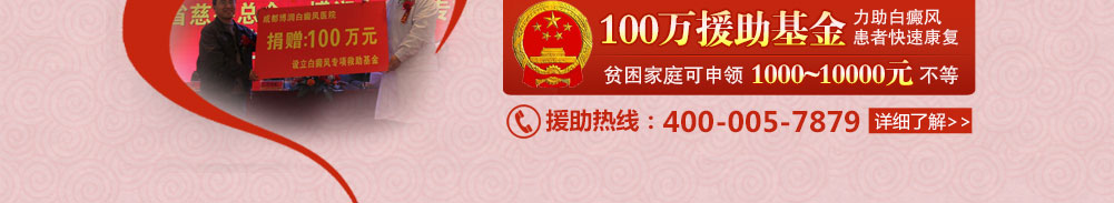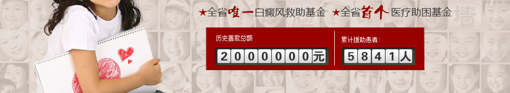 "四川省慈善总会·博润白癜风专项基金"是成都白癜风医学研究院附属医院与四川省慈善总会于2012年创立,创办资金是一百万元人民币,其后,医院不断追加捐赠。成立之初,"四川省慈善总会·博润白癜风专项基金"秉承着"让慈善成为一种幸福,让爱心滋润每一寸皮肤"的宗旨,以完善的慈善公益计划和专项运作的形式,为贫困白癜风患者提供长期、实在的白癜风康复关注和医疗援助,获得广大白癜风患者的一致好评…[详细]