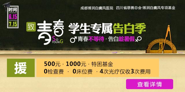 高发期遇上黄金治疗期,恰逢中高考的结束、大四毕业生的学习生涯的结束,莘莘学子结束一段征程,即将迎来新的学习或工作生涯。为了更好地帮助本届毕业生、在读生等广大青少年学生患者利用假期时间尽快康复,不影响后期学习,成都博润白癜风医院联合四川省慈善总会·博润白癜风专项基金,特在暑假期间开展“致青春•学生专属告白季”基金援助活动!
